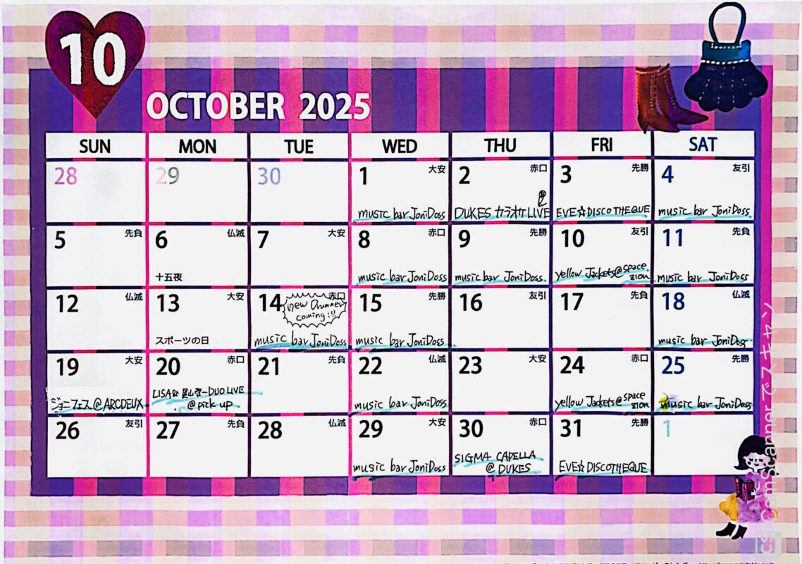 JoniDoss出演は10/1(水)、4(土)、8(水)、9(木)、11(土)、14(火)、15(水)、18(土)、22(水)、25(土)の出演!14日はJoniDossに新しいドラマーが仲間入り!!!皆様ぜひ応援にきてくださ〜い!!!